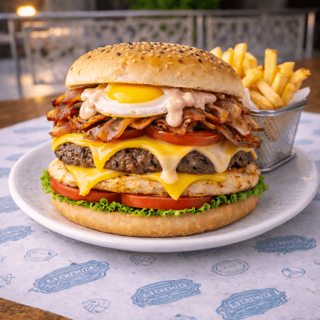 La más completa: 250 g de carne, pollo al grill, doble queso, doble tocineta, huevo, vegetales y salsas especiales.