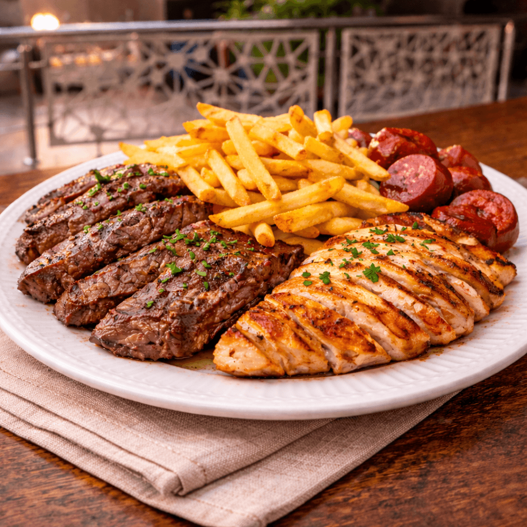 Combinación de lomito, pechuga de pollo, chorizo, queso y papas fritas. Perfecta para compartir.
